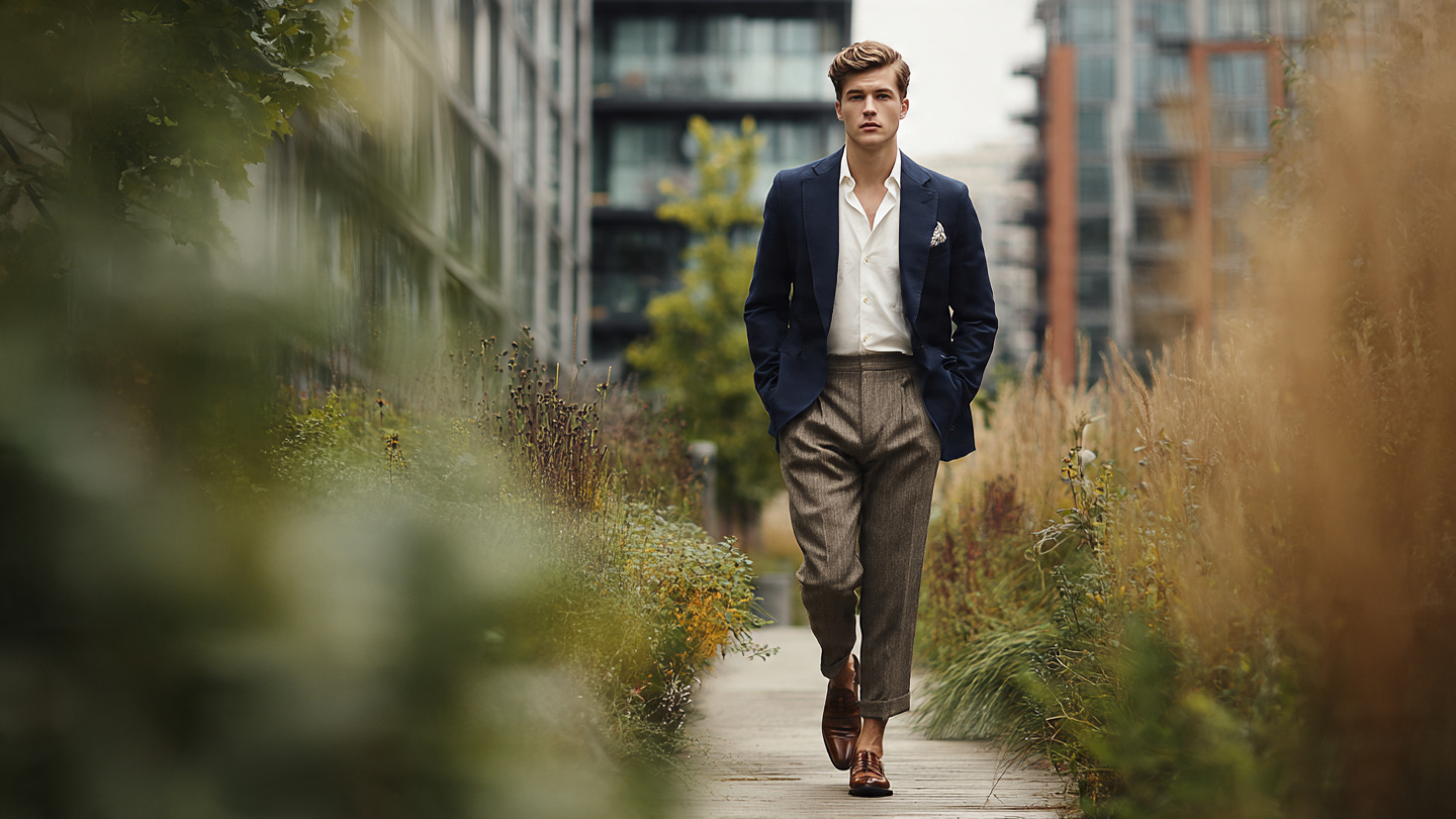 Modern take on vintage 1920s menswear: high-rise trousers, unstructured blazer. Roaring Twenties style adapted for today—beyond Gatsby fashion menswear clichés.