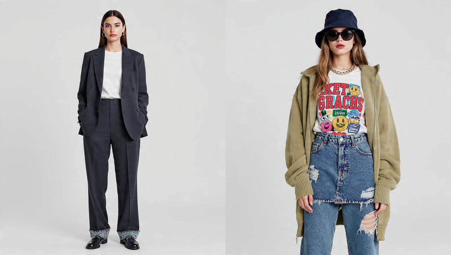 - Streetwear/hip-hop: baggy fits, bold outerwear, sneakers, caps.