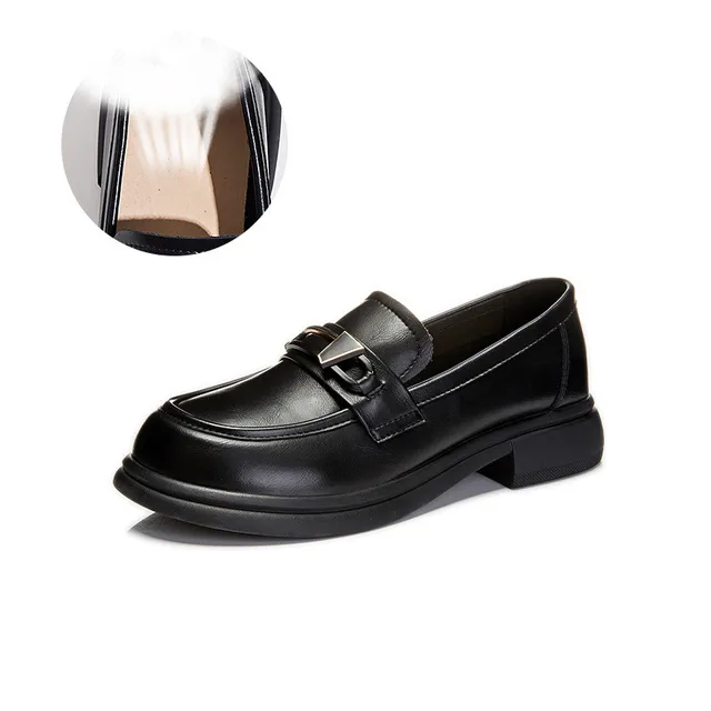 Effortless, refined, and grounded in old-money sensibility, the Vorithane Minimalist Thick-Heel Leather Loafer is crafted for the modern woman who values comfort without compromise. Made from soft genuine leather with a smooth finish, these shallow-mouth loafers feature a 2.5 cm stacked block heel for subtle lift and all-day stability, paired with a flexible rubber sole for quiet confidence on city streets or office floors. The clean lines, low collar, and absence of logos embody understated luxury—perfect for pairing with tailored trousers, midi skirts, or summer linen.